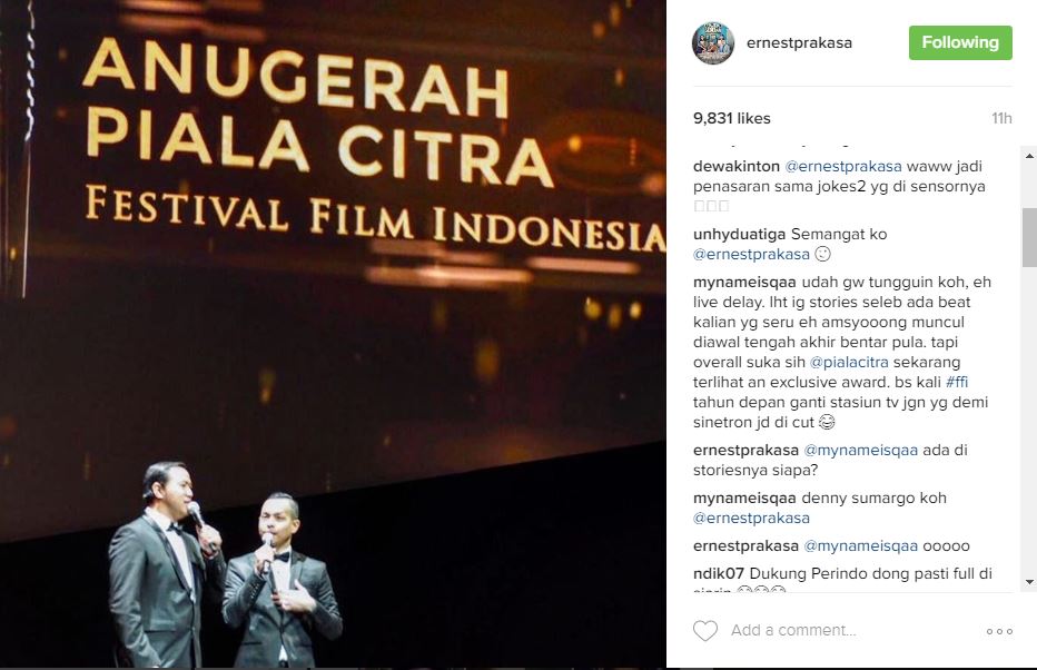 "Malam ini menyenangkan sekali. Nge-host brg @pandji.pragiwaksono, ngelempar jokes2 seputar industri perfilman di @PialaCitra 2016. Sayangnya, pas tayang di TV bagian gw sama Pandji dibabat abis. Entah kenapa. Semoga ini bukan kali terakhir kami berdua bisa melakukan ini, " tulis Ernest dalam caption.