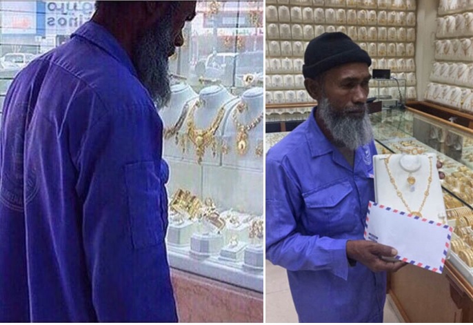 Terdapat sebuah akun yang memposting gambar dari seorang petugas kebersihan yang sedang menatap jendela kaca sebuah perhiasan mewah.