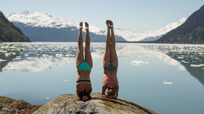 Mereka malah melakukan praktek yoga di gunung es dengan hanya mengenakan bikini.