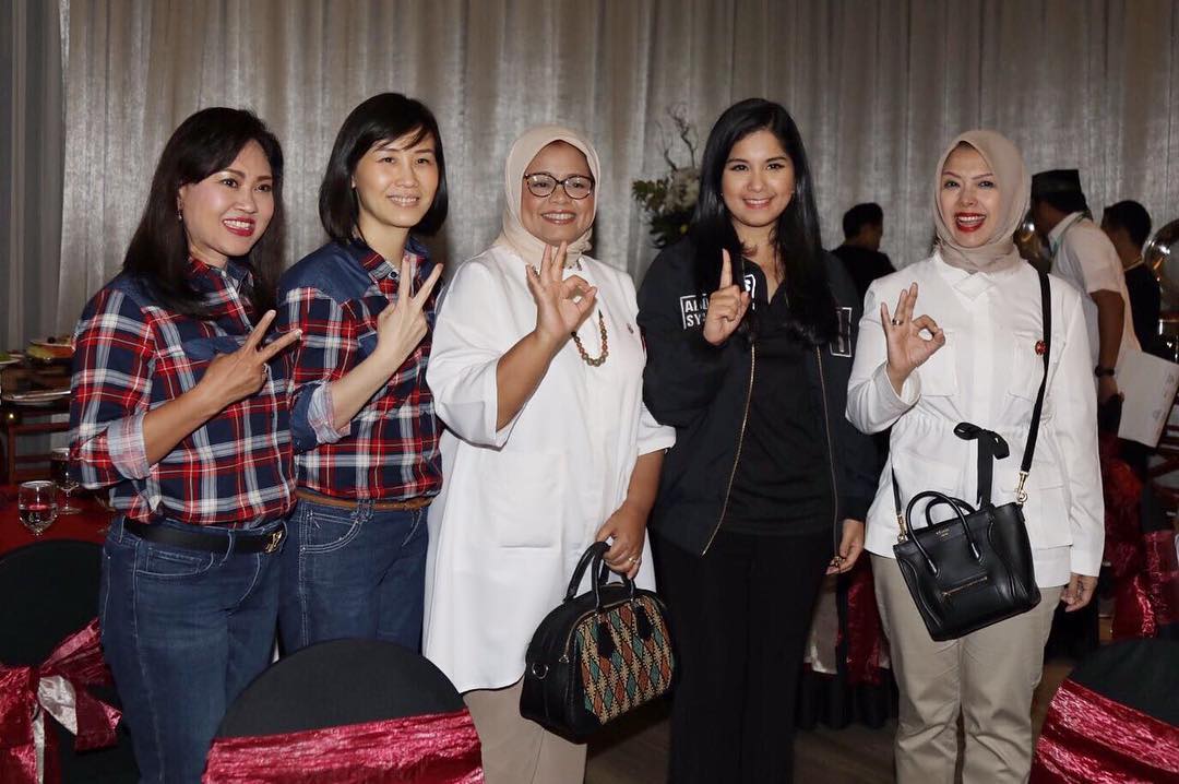 Kelima wanita cantik tersebut kompak berfoto bersama sambil mengacungkan jarinya sesuai dengan nomor urut suami masing-masing.