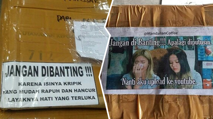 Berikut ini ada beberapa tulisan pesan 'jangan dibanting' yang ditempelkan di paket barang. Tapi tulisannya bukan tulisan biasa. ASli kocak abis!