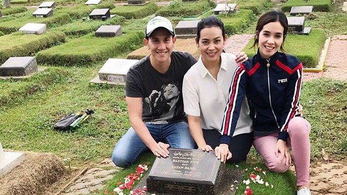 Ditemani salah satu rekannya, pasangan suami istri ziarah ke makam ayah Vino, Bastian Tito.