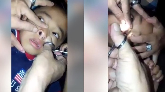 Saat pria yang memegang gunting berusaha menjangkau benda yang ada di dalam hidung si anak semuanya menjadi hening.