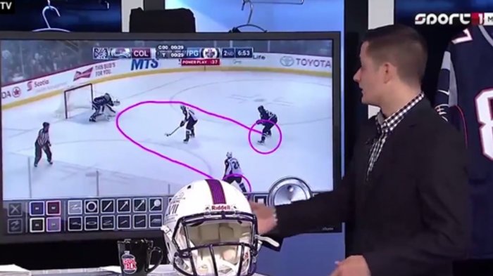 Analis olahraga pria ini berusaha menjelaskan bagaimana jalannya pertandingan hoki itu dengan bantuan layar LCD.