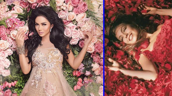 Di foto tersebut, Krisdayanti menjelma bak seorang ratu di atas hamparan bunga.