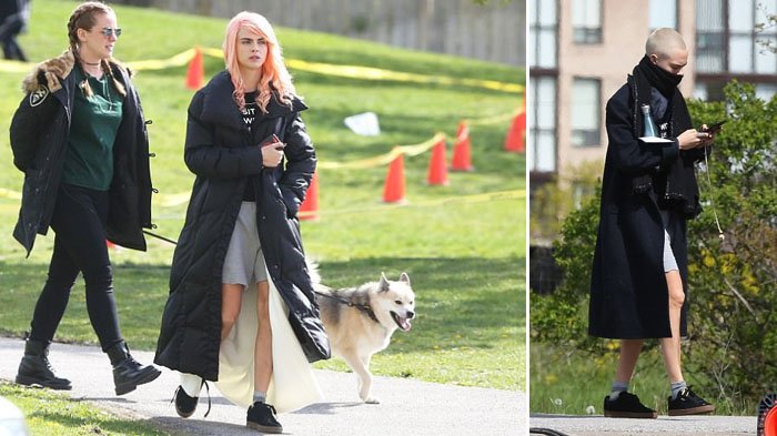 Di Sela-sela Syuting Cara Delevingne Lepas Wig Merah Muda dan Tampil Boyish dengan Kepala Plontos
