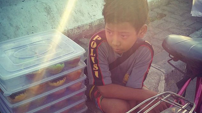 Dia berjualan kue untuk membantu ibu dan adik-adiknya