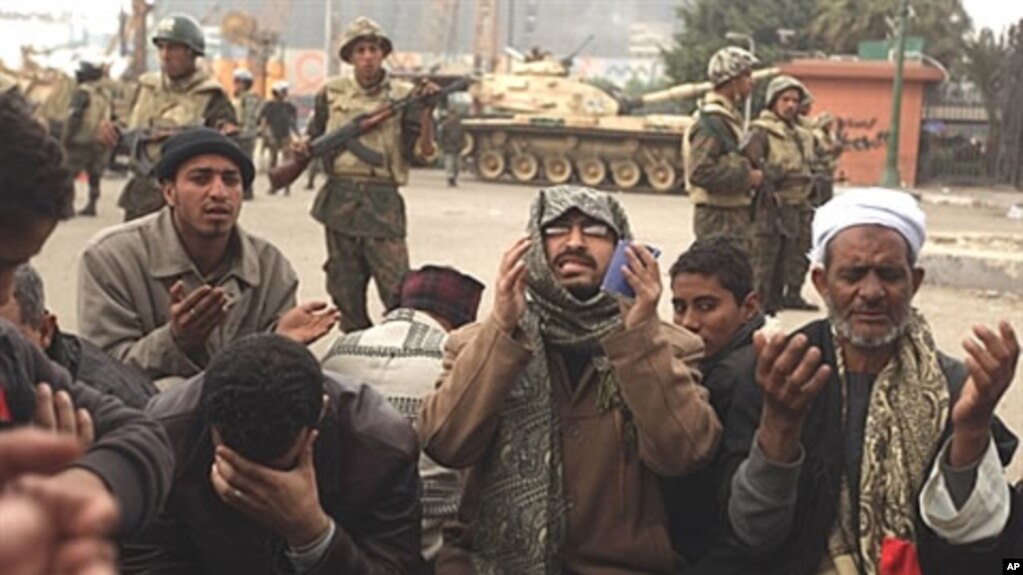 Gerakan Persaudaraan Muslim Mesier menengadahkan tangan mereka di diaerah konfik di depan tentara bersenjata dan tank.