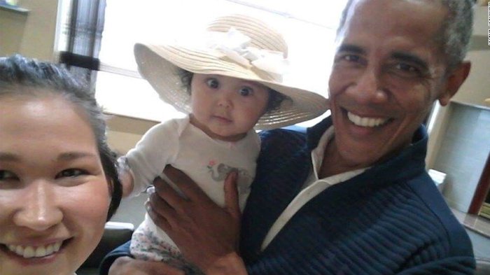 Seorang pengguna Twitter @essayjenkins mengomentari foto tersebut, "Lihatlah ekspresi bayi tersebut, seakan ia sadar bertemu Presiden Obama."