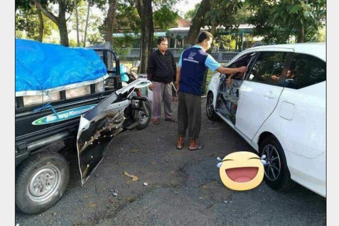Namun dalam unggahan Oki, disebut bahwa motor roda tiga itu bermerek Fukuda, dan mobil yang pintunye mengelupas adalah Toyota Calya.