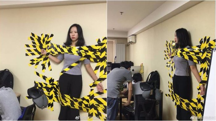 Sebuah foto yang menunjukan seorang wanita berpakaian rapi ditempelkan di dinding menjadi viral di media sosial Tiongkok, Weibo.