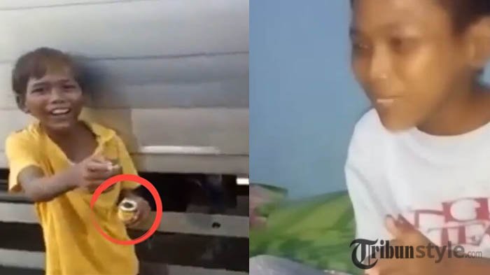 Rekaman itu menunjukan seorang bocah tengah asyik menghisap lem di samping truk.