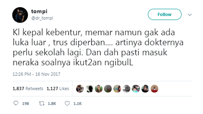 "Dr ferdiriva dan dr Tompi sampe komentar gini deh..moga2 dokter jaga UGDnya beserta tim kesehatannya menangani, memberi keterangan yg sejujur2nya sesuai sumpah dokter dan perawat kala itu,"
