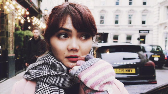 Rina terlihat memakai jaket tebal warna abu-abu yang dipadukan dengan jeans dan sepatu boot panjang warna hitam.