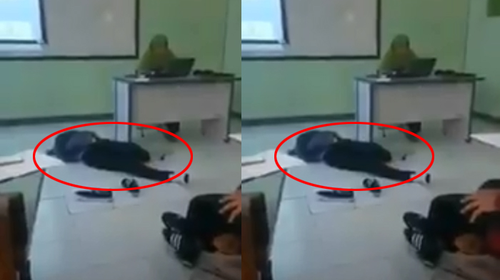 Video berdurasi satu menit itu menjukan seorang lelaki dewasa sedang terkapar di depan kelas.