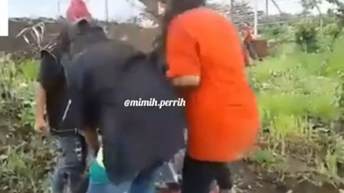 Mereka terlihat menjambak seorang gadis berbaju biru.