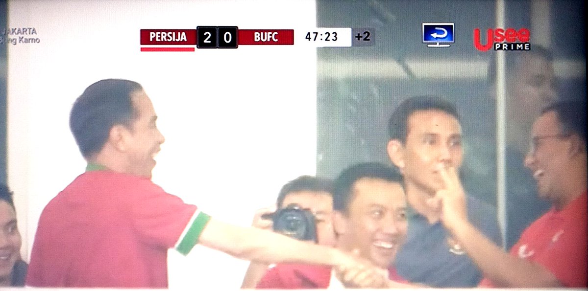Lalu, saat pemain Persija Jakarta Marko Simic mencetak gol untuk kedua kalinya dalam pertandingan tersebut, Presiden Joko Widodo langsung berdiri menyalami Gubernur Anies Baswedan yang duduk sejajar dengannya.