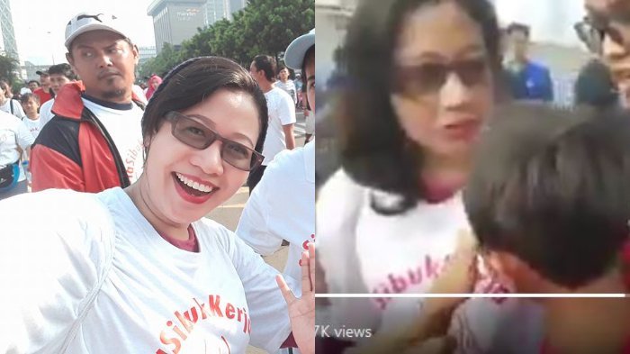 Wanita yang diketahui bernama Susi Ferawati dan anaknya yang mengenakan kaos dengan tulisan #DiaSibukKerja dikerumuni oleh beberapa orang pria yang tampak mengibaskan uang di depan wajahnya.