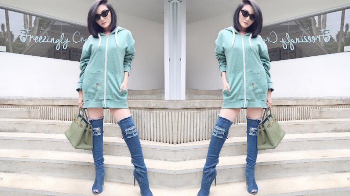 Nggak ada salahnya juga lho kamu memadukan denim dengan denim seperti yang dilakukan Kiki Amalia ini.