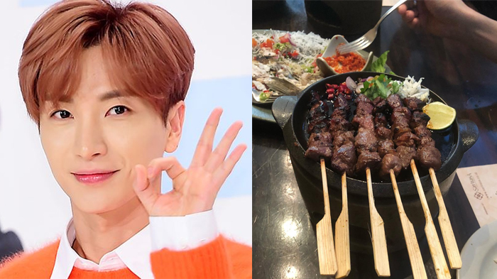 Sedangkan, pada foto kedua, Leeteuk terlihat memotret sate kambing.