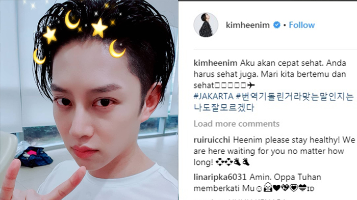 Tak ingin membuat penggemarnya khwatir, Heechul pun mengunggah foto selfie dirinya sambil menerangkan kondisinya dalam Bahasa Indonesia.
