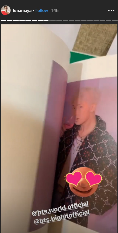Luna membuka photobook sambil melihat foto-foto member BTS.