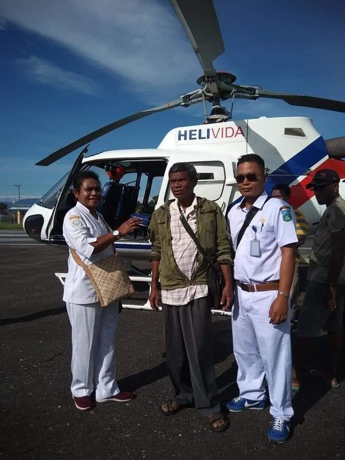 Mantri Patra bersama rekannya yang berpose di depan helikopter yang membawa mereka ke Kampung Oye.