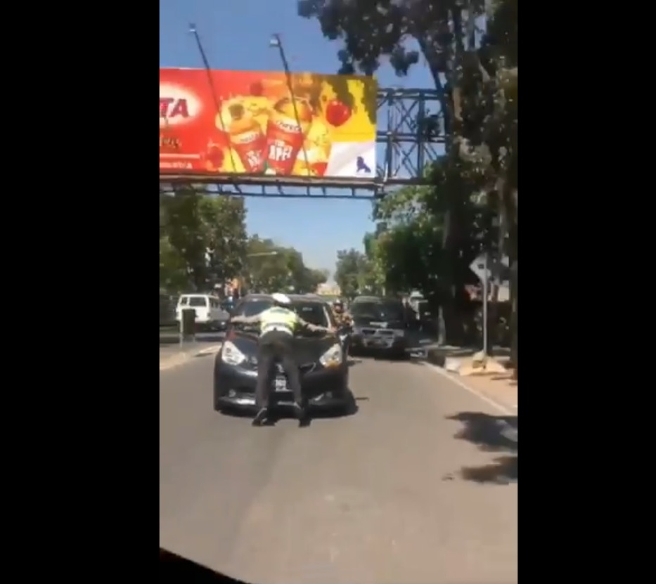 Dalam video tersebut, polisi itu tampak mencoba menghentikan mobil yang sedang melaju.