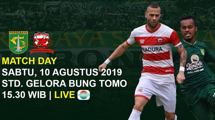 Pertandingan Persebaya Surabaya Vs Madura United akan berlangsung di Stadion Gelora Bung Tomo Surabaya pada Sabtu (10/8/2019) pukul 15.30 yang di siarkan langsung di Indosiar dan dapat diakses melalui Link live streaming.
