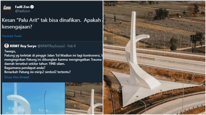 Unggahan viral patung tol Madiun tersebut dibagikan oleh akun Twitter @KRMTRoySuryo2 lalu direspons pula oleh pemilik akun @fadlizon.