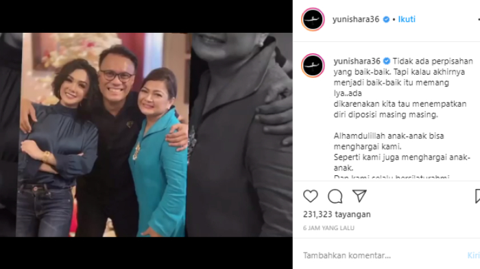 "Tidak ada perpisahan yang baik-baik. Tapi kalau akhirnya menjadi baik-baik itu memang Iya..ada dikarenakan kita tau menempatkan diri di posisi masing masing," tulis Yuni.