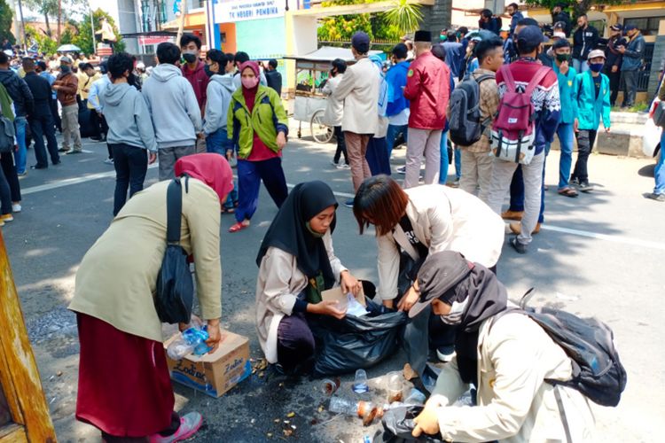 Mahasiswa dan aktivis lingkungan punguti sampah di area demo saat berlangsungnya aksi protes tolak Undang-undang Cipta Kerja