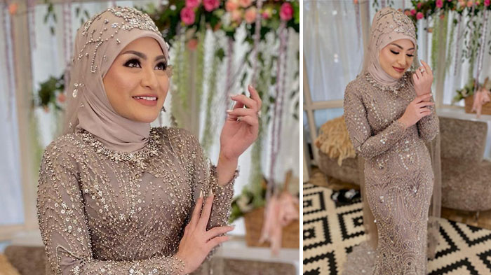 Gaun cantiknya dipadukan dengan hijab warna senada dengan tudung pengantin yang menjuntai hingga kaki.