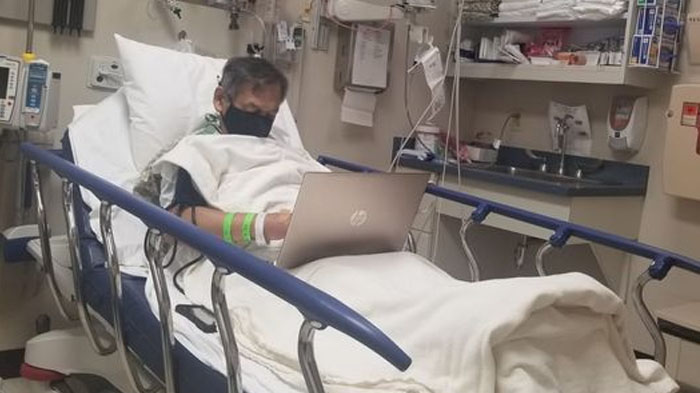 Dalam foto tersebut, terlihat sang ayah sedang membuka laptop di atas ranjang rumah sakit.