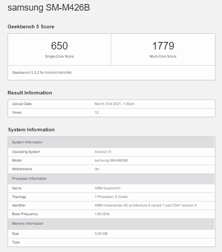 Pada website benchmark Geekbench, Galaxy M42 5G muncul dengan nomor model SM-M426B.