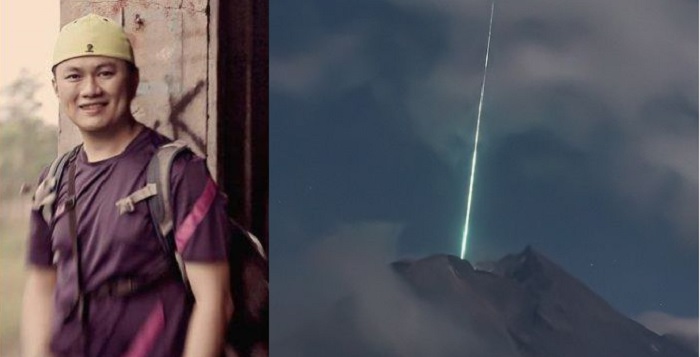 Foto itu merekam momen langka ketika obyek langit berupa cahaya putih kehijauan terlihat jatuh mengarah di sekitar puncak Gunung Merapi.