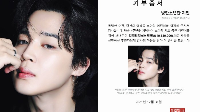 Penggemar Jimin rayakan ulang tahun ke-3 lagu 'Promise' dengan berdonasi ke Yayasan Leukemia Anak Korea untuk membantu mendukung pengobatan kanker.
