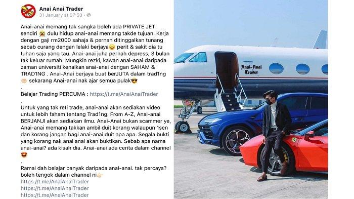 Pria yang mengaku sebagai master trader ini, awalnya memposting foto dirinya dengan jet pribadi.