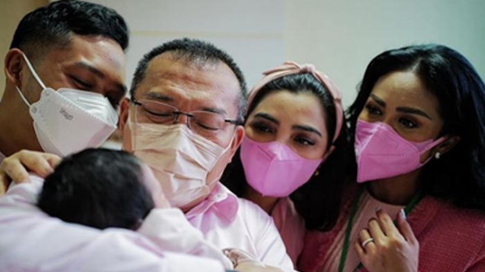 Terlihat dari foto tersebut, Anang mengendong cucunya ditemani Ashanty, Azriel, dan mantan istrinya Krisdayanti. Mereka tampak kompak mengenakan setelan baju bernuansa Pink muda menyambut Baby AH.