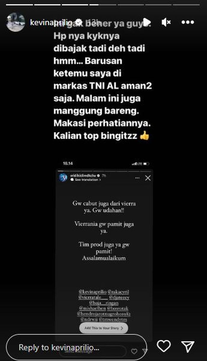 Namun tak ama kemudian, Kevin Aprilio, pianis grup Vierratale mengunggah Instagram Story untuk mengklarifikasi pernyataan Widy.