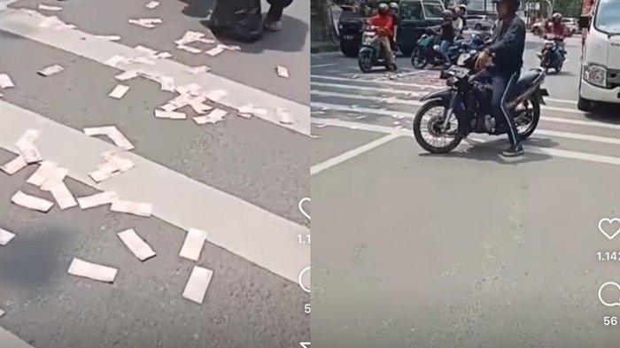 Sejumlah pengendara sepeda motor pun terlihat sibuk mengumpulkan lembaran uang yang berserakan di jalan tersebut.