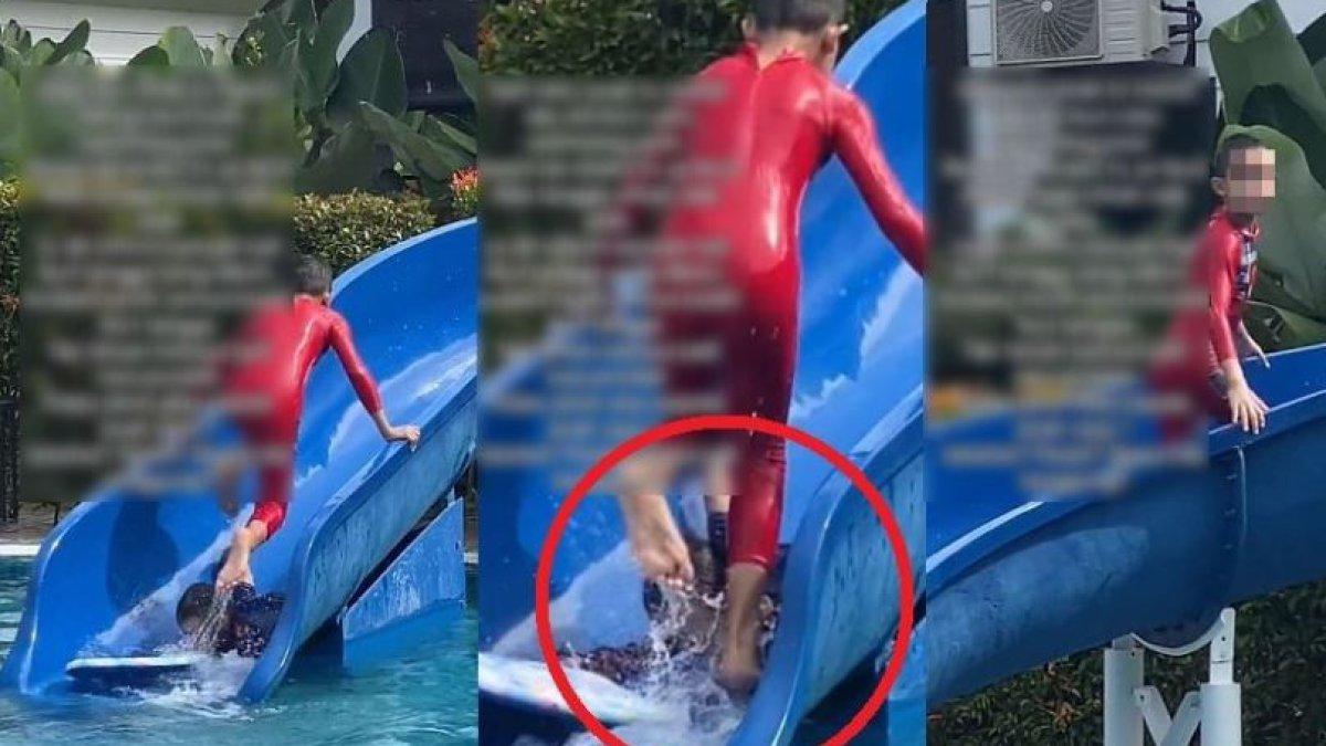 Jika dilihat dari rekaman gerak lambat, terlihat jelas kaki bocah tersebut menaiki perosotan dari arah kolam berenang dan hampir mengenai kepala putranya.