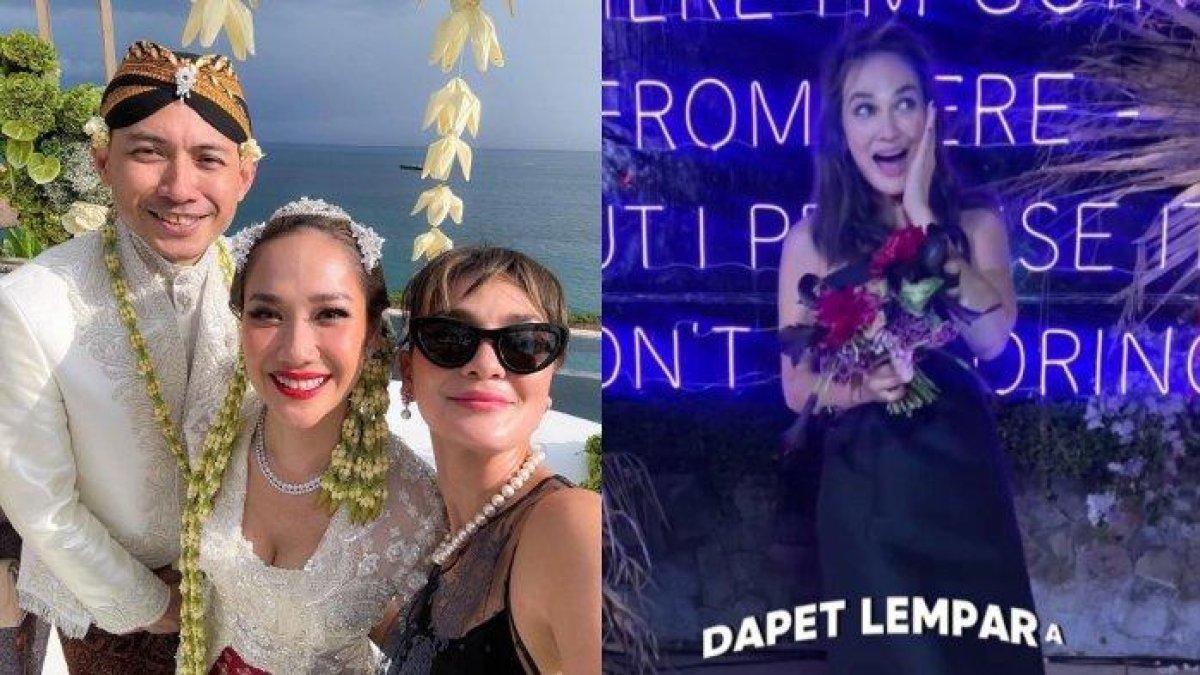 Ekspresi Luna Maya saat berhasil tangkap lemparan bunga di nikahan BCL dan Tiko Aryawardhana: emang artinya apa sih?