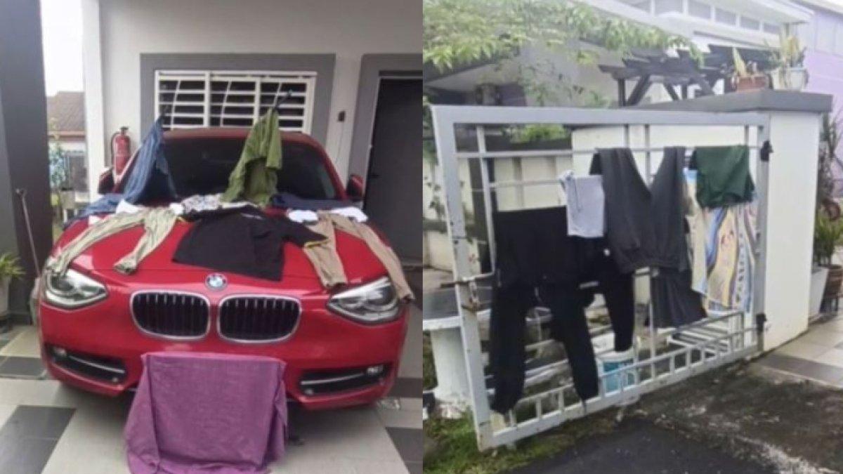 AKSI kocak suami bantu ringankan pekerjaan istri malah buat syok, jemur pakaian di pagar hingga mobil.