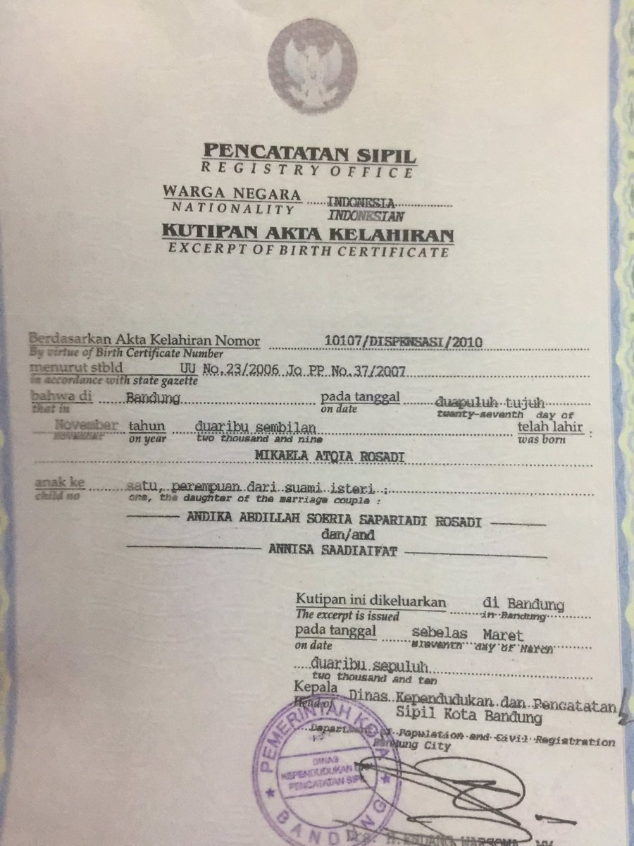 Dirinya juga mengunggah foto akta kelahiran sang anak.