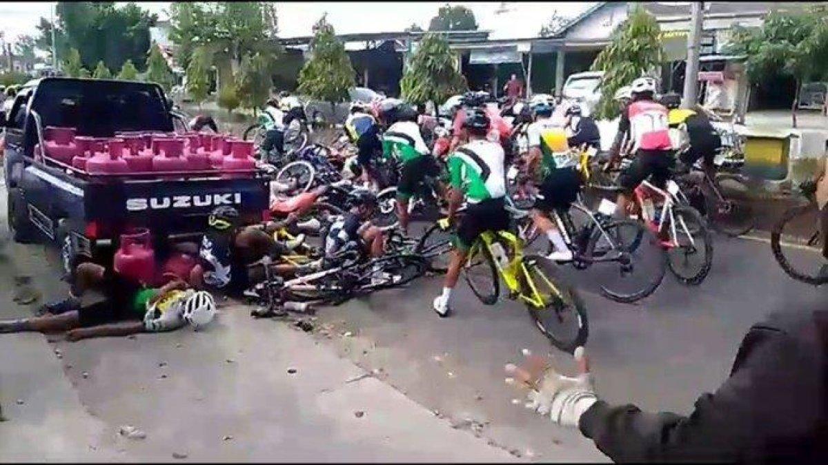 Sejumlah atlet balap sepeda alami tabrakan beruntun di Lubuklinggau, Sumatera Selatan. Bahkan ada yang nyungsep ke bawah mobil pengangkut gas elpiji.