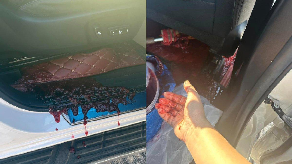 Seorang pengguna Facebook syok mendapati noda cairan bak darah lumuri karpet hingga pintu mobilnya. Dikira darah, ternyata selai stroberi.