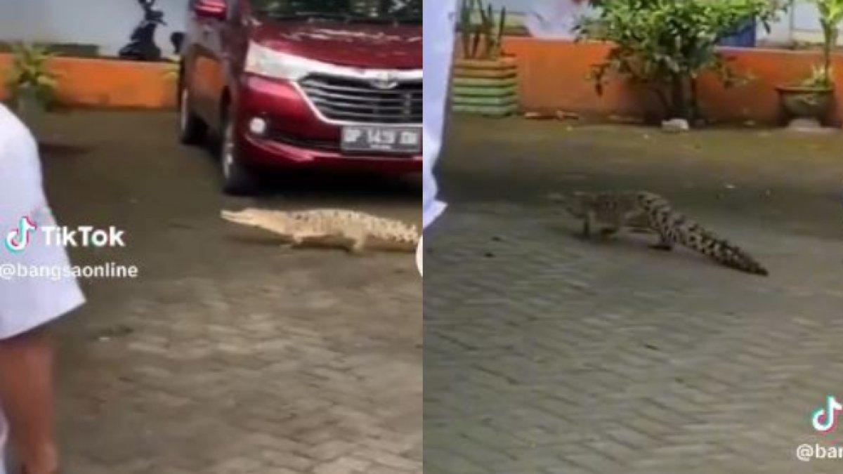 Ini detik-detik buaya sepanjang 2 meter masuk di SMP Angkasa Lanud Sultan Hasanuddin, Kabupaten Maros, Sulawesi Selatan. Gegerkan guru hingga murid.