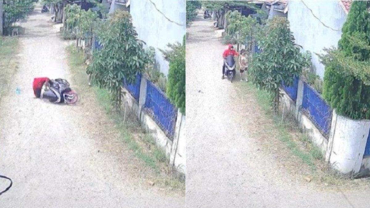 Viral detik-detik jambret jatuh dari motor usai gagal beraksi di Tambun Bekasi, pelaku kaget saat korban teriak.